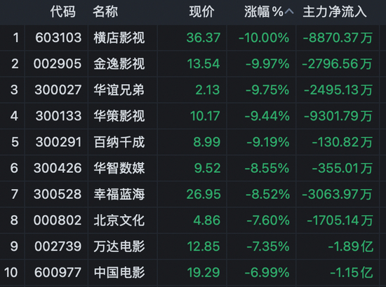 而前两日高歌猛进的影视板块开始熄火。横店影视、金逸影视跌停,百纳千成、华谊兄弟、华策影视跌超9%,幸福蓝海、北京文化、万达电影等跟跌。