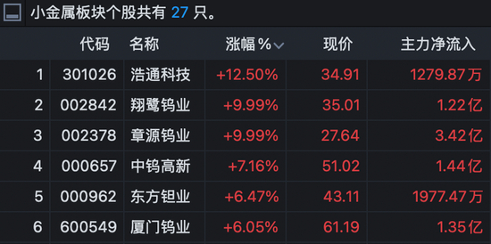 2月11日早盘,A股主力资金加速流入金属板块。小金属、钴、镍概念股涨幅居前。翔鹭钨业、章源钨业涨停,浩通科技涨超12%。