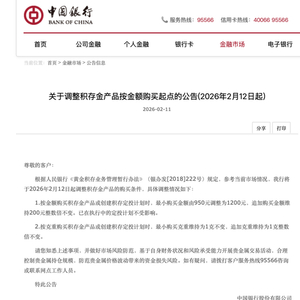 中国银行表示,根据人民银行《黄金积存业务管理暂行办法》规定,参考当前市场情况,将于2026年2月12日起调整积存金产品的购买条件,具体调整情况如下: