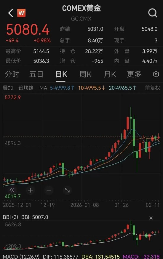 截至发稿,COMEX黄金报5080.4美元/盎司,上涨0.98%;伦敦金报5072美元/盎司,上涨0.88%。