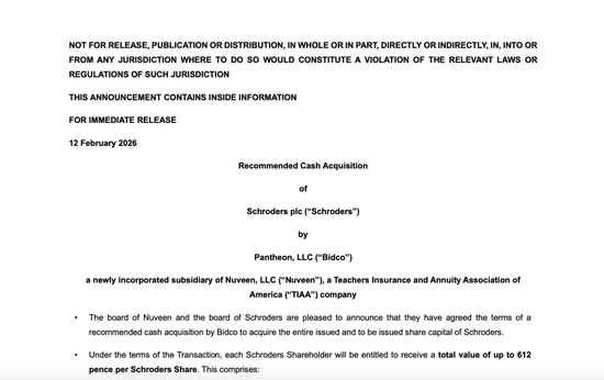 2月12日,拥有222年历史的英国老牌家族企业——施罗德集团在官网发布公告称,同意接受美国资产管理机构美国教师保险和年金协会(TIAA)子公司Nuveen的收购。