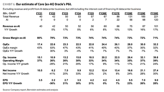 伯恩斯坦在最新模型中进一步剥离AI业务,清晰勾勒出甲骨文核心业务的独立价值。即便完全剔除AI数据中心相关收入,仅凭传统数据库、SaaS及OCI业务,公司到2030财年的总收入仍可达1010亿美元。