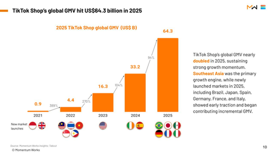 据新加坡风投机构Momentum Works联合视频商务数据平台Tabcut发布的TikTok Shop市场报告,2025年TikTok Shop电商业务覆盖16个市场,全球GMV达到643亿美元(折合人民币约4444亿元),同比暴涨94%。