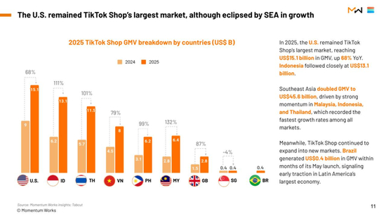 具体来看,美国依然是TikTok Shop最大单一市场,GMV达到151亿美元;但增速有所放缓,同比增幅约68%。