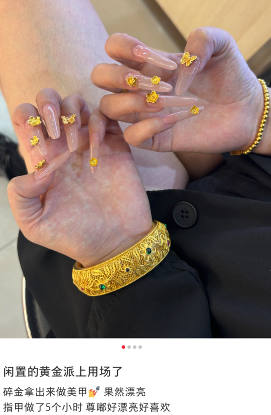 据《每日经济新闻》报道,周大福等头部品牌的小件金饰,甚至老铺黄金的金条都成了美甲店的“高端原料”,有消费者表示,愿意花数千元、上万元打造“黄金甲”。