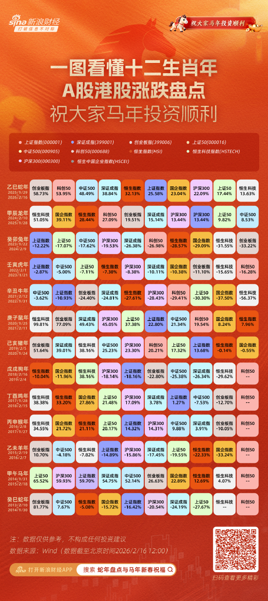 2月16日,港股农历蛇年最后一个交易日收盘,从蛇年全年表现看,恒生指数累涨超32%,恒生科技指数累涨超13%,国企指数累涨超23%。此外,A股2月13日蛇年收官,上证指数蛇年累计上涨25.58%,深证成指累涨38.84%,创业板指大涨近60%领跑A股+H股主要指数,科创50指数大涨超50%。值得一提的是,农历蛇年A股、港股主要指数均实现上涨。