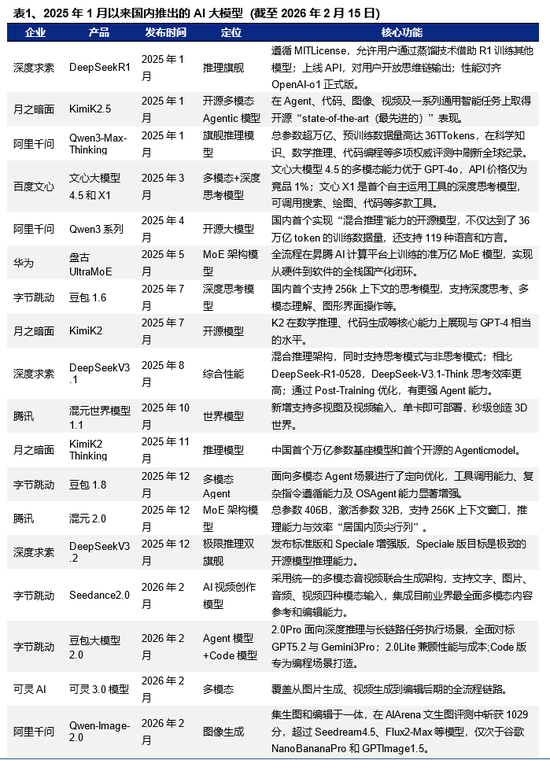 国内,AI应用迎来爆发拐点,吸引更多科技巨头布局,模型迭代与场景渗透有望实现共振。2025年是国内AI模型迭代与应用落地的关键一年,DeepSeek作为2025年AI领域的核心黑马,全年完成多轮模型迭代。DeepSeek-R1、V3.2系列开源后,阿里通义千问、MiniMax等头部模型加速开源,引领AI应用落地。其中,阿里Qwen3系列以256K长上下文、百万token扩展能力及低成本优势成为全球开源标杆。此外,2025年国内AI竞争重心从纯模型参数比拼转向应用落地能力。国内AI应用巨头纷纷通过核心业务实现卡位,字节豆包升级为跨生态智能体并接入抖音、今日头条,阿里通义千问融入电商、钉钉生态,腾讯元宝深度嵌入微信与QQ社交链条。国内企业加速布局消费端和产业端AI应用,阿里初步构建“AI下单、AI订票、AI客服”全链路闭环能力,腾讯元宝春节红包活动带动用户激增,字节以“豆包”为核心C端入口,并于2026年2月发布新一代视频生成模型Seedance2.0,实现了AI视频从生成到商用的跨越式突破。展望2026年,国内AI应用有望完成从模型落地到场景变现、从概念叙事到业绩兑现的转化,模型迭代与场景渗透有望实现共振。