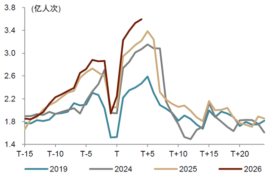 注:横轴按农历日期对齐排列,T为春节当日,T+n表示节后n天,T-n表示节前n天资料来源:交通运输部,中金公司研究部