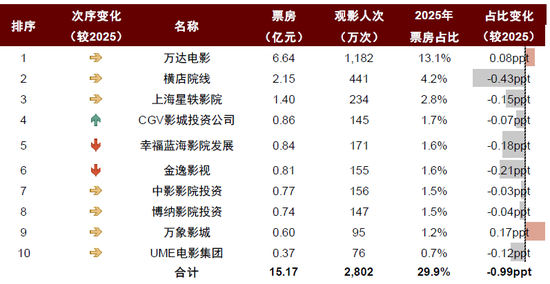 图表:2026年春节档影投公司市场份额:万达电影、横店院线位列前两名