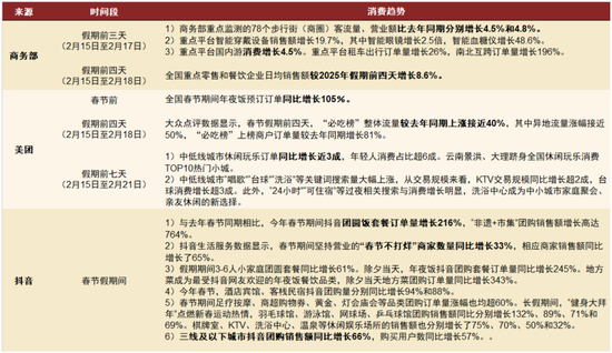 餐饮:餐饮消费持续释放潜力,小城美食关注度提升。商务大数据[57]显示,假期前四天(2026/2/16-2026/2/19),全国重点零售和餐饮企业日均销售额较2025年春节前四天增长8.6%(vs. 25年国庆同比+2.7%)。大众点评数据[58]显示,假期前四天(2026/2/16-2026/2/19),汕头、顺德、泉州、珠海、三亚为总体流量Top5“宝藏”美食城市;开封、泰安、大同、连云港、延安为增幅最高的“宝藏”城市,较去年春节同期增幅均在200%左右。我们估计现制饮品受旺季及“千问”免单卡[59]等活动拉动表现较好。