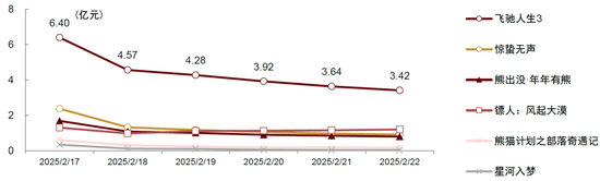 《飞驰人生3》票房领跑,头部集中效应明显。根据艺恩,《飞驰人生3》实现票房26.2亿元,票房占比51.7%,《惊蛰无声》《镖人:风起大漠》分别位居档期第二和第三,两者票房占比15.5%和13.6%,《镖人:风起大漠》票房自2月19日开始呈提升趋势。我们认为,今年春节档头部效应明显。根据猫眼专业版,《飞驰人生3》预测总票房超42亿元,《镖人:风起大漠》超13亿元,《惊蛰无声》超12亿元。
