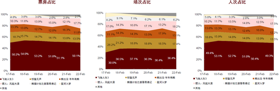 图表:2026年春节档6部主要影片票房、场次、人次占比日度变化(2026年2月17日~2月22日)