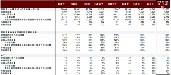 旅游:春节国内旅游人次增幅明显、环比提速。据交通运输部数据[35]和我们估算,除夕至初五(2026/2/16-2026/2/21)全社会跨区域人员流动量同比增长约9.1%,其中铁路客运量同比增长约10.7%、公路人员流动量同比增长约9.0%、水路客运量同比增长约28.6%、民航客运量同比增长约8.0%。对比2025年春节假期(2025/1/28-2025/2/4),2026年春节假期出行人次增幅环比增长3.3ppt(2025年春节假期全社会跨区域人员流动量同比+5.8%,其中铁路客运量/公路人员流动量/水路客运量/民航客运量同比增长约5.0%/5.8%/7.1%/2.9%)。对比2025年中秋国庆假期(2025/10/1-2025/10/8),春节假期出行人次增幅环比增长2.9ppt(中秋国庆假期全社会跨区域人员流动量同比+6.2%,其中铁路客运量/公路人员流动量/水路客运量/民航客运量日均同比增长约 2.6%/6.5%/4.2%/3.4%)。