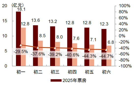 图表:2026年春节档初一至初六单日票房:同比大幅下降