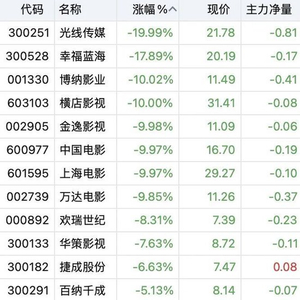 多只影视股跌停 第一财经 第一财经官方账号 02.2410:30 关注 2月24日早盘,影视股持续走低,截至发稿,光线传媒、博纳影业、横店影视、金逸影视、中国电影跌停,幸福蓝海跌超17%,万达电影、欢瑞世纪等跟跌。