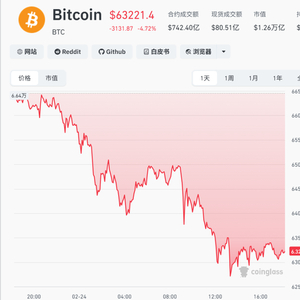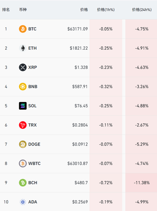 继昨日大跌后,224日,加密货币市场延续跌势。比特币价格震荡下行,数次跌破63000美元,最低跌至62700美元附近。