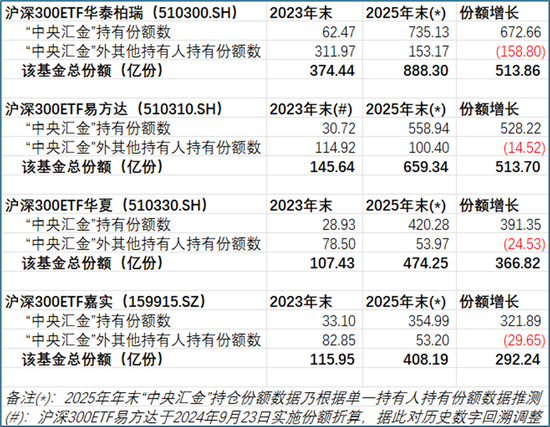 以华泰柏瑞、易方达、华夏、嘉实沪深300ETF(以下简称“四大沪深300ETF”)为例,2025年年末时,汇金持有的基金份额占比均超过80%,汇金以外的其他持有人持有的基金份额占比相对较少。