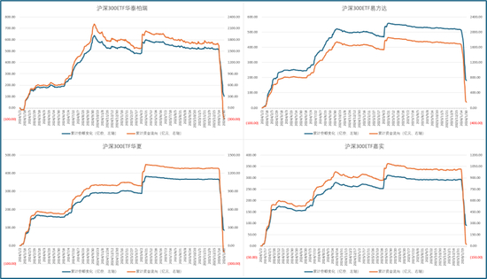 再以四大沪深300ETF为例,测算2024年1月2日(2024年的第一个交易日)至2026年2月2日期间每个交易日的流通份额变化数量,并再根据当日成交均价来估算每个交易日的资金流向,由此计算期间累计份额变化量和累计资金流入量。我们可以发现,截至2026年2月2日,四大沪深300ETF依然保留了2024年以来的部分份额净增量,但累计资金流向总体已转为净流出。