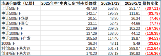 2026年1月14日至2月2日,四大沪深300ETF的成交量均明显放大,并伴随流通份额数量的大幅减少。由于流通份额减少的数量大于汇金以外的其他持有人持有的份额数,因此合理推测汇金在此期间降低了四大沪深300ETF的持有数量。