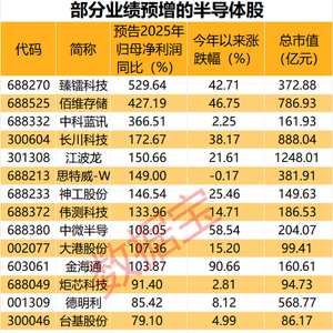 据证券时报·数据宝统计,A股中属于半导体细分行业的个股共有173只,目前已有124股发布2025年度业绩预告、业绩快报或年报,其中46股净利润预增,13股预计扭亏,22股预计减亏(归母净利润按年报、业绩快报、业绩预告下限计算)。
