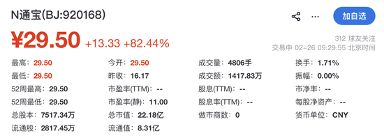 瑞财经 吴文婷 2月26日,通宝光电(920168.BJ)在北交所挂牌上市,保荐机构为东吴证券。其开盘报29.5元,涨82.44%,总市值22.18亿元。