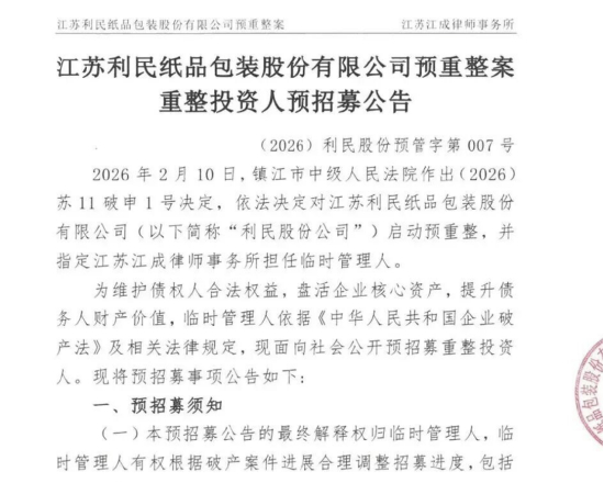 值得注意的是,法院选择的是“预重整”,而非直接破产清算。与清算不同,预重整意味着企业仍被视为具有挽救价值的主体。利民纸品目前由江苏江成律师事务所担任临时管理人,并公开招募重整投资人,报名截止至2026年3月31日。对外界而言,这既是一次债务重组窗口,也是对其资产与品牌价值的重新评估。