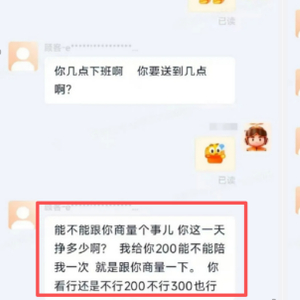 据涉事女骑手小葛个人社交平台发布信息,4天前,自己在派送外卖时,忽然收到男顾客王某某通过淘宝闪送发来的露骨信息:“能不能跟你商量个事儿,你这一天挣多少啊?我给你200能不能陪我一次,就是跟你商量一下,你看行还是不,200不行300也行。”