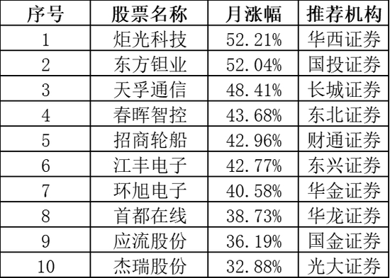 此外,由东北证券推荐的春晖智控、财通证券推荐的招商轮船、东兴证券推荐的江丰电子、华金证券推荐的环旭电子当月涨幅也超40%。
