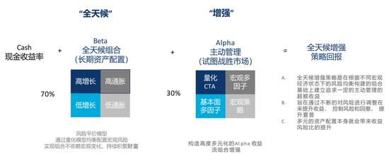 因为缺工具、缺杠杆,国产全天候本质是戴着镣铐跳舞,左边的全天候组合四象限更多是分散资产、降低波动的作用,要做出差异更依赖于右边主动管理部分的表达。
