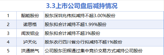 据统计,3月3日,盘后贵州茅台、宁德时代、工业富联、华安证券、中国巨石、通化金马披露增持情况。包括韶能股份、闽发铝业、诺思格、洪通燃气、泸天化在内的5家A股上市公司披露减持情况。