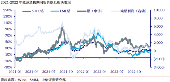 ▍2021-22年能源危机期间,铝价和板块涨幅达到60%/100%。
