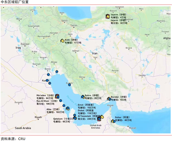 据ALD和SMM,2025年,中东区域氧化铝产能约450万吨/年,占全球2%;电解铝产能约692万吨/年,占全球9%;2025年伊朗电解铝产量约62万吨,占全球0.8%。若是周边能源基建遇袭,上述产能存在减停产风险。此外,据阿拉丁,若是霍尔木兹海峡封锁,除沙特阿拉伯铝土矿和氧化铝基本自给自足外,阿联酋和伊朗2023年分别进口氧化铝280万吨和50万吨以上,面临原料断供和电解铝减停产风险;阿曼、卡塔尔、巴林几乎完全依靠进口氧化铝维持其电解铝生产,主要采购自澳大利亚和印度,运输路线主要为“印度洋-霍尔木兹海峡-波斯湾”,封锁将导致三个国家氧化铝供给完全中断,从而对于上述铝厂产生严重影响。