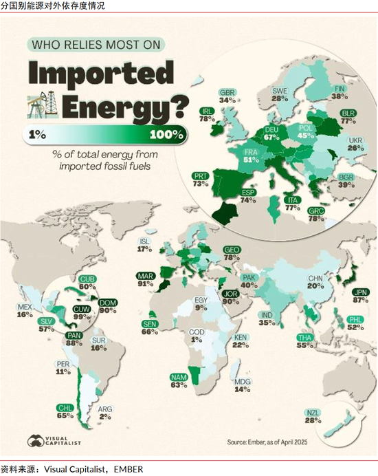 据美国能源信息署,霍尔木兹海峡石油运输量占全球海运石油贸易总量1/4以上;2024年全球约1/5的液化天然气贸易经由霍尔木兹海峡运输。据路透社,3月2日,德国和法国日前电力价格相较上周五上涨12%和109%。若是霍尔木兹海峡封锁持续,油气价格和海外电价或将持续大幅上升,二次能源危机成为可能。作为用电密度最高的金属之一,能源价格变化对于铝产业影响尤为深刻。据EMBER,我国能源进口依存度为20%,相对较低。我国能源价格亦具备优势。若是能源危机再次发生,其所导致的海外成本推动式铝价上涨将显著提升我国铝企盈利。