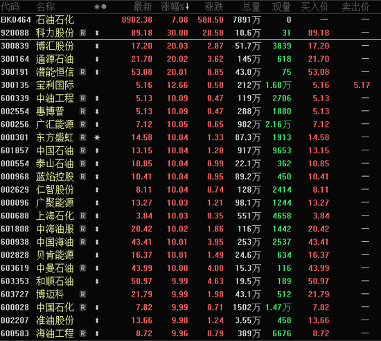 有着“三桶油”之称的中国石油、中国海油、中国石化也封上涨停板。值得一提的是,继3月2日历史性首次集体涨停后,上述三家公司再度携手封板,再现“三桶油”齐涨盛况。