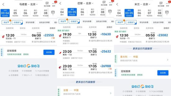 不仅是马德里,巴黎—北京、米兰—北京等多条航线的票价在3月4日—7日均出现上涨。3月4日和5日的巴黎—北京航班仅有少量1万元左右的国航经济舱机票,东航与法国航空的经济舱票价都已超过2万元。米兰—北京3月4日的国航航班仅剩超5万元的公务舱机票,3月5日还有少量超2万元的超级经济舱机票。