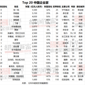 3月5日,胡润研究院发布《2026胡润全球富豪榜》,字节跳动创始人张一鸣以5500亿元人民币财富成为中国首富,财富增长32%。