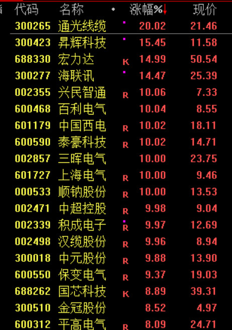电网设备板块延续涨势,中国西电涨停创历史新高,汉缆股份、顺钠股份、积成电子均2连板。