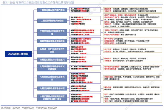 2026年政府工作任务:(1)扩大内需仍居首位。消费端着力提升居民收入与消费能力,在稳定就业、实施居民增收计划的同时,通过消费品以旧换新、消费信贷支持以及文旅等服务消费拓展需求空间;投资端则通过中央预算内投资、超长期特别国债和政策性金融工具支持“两重”建设,并引导社会资本投向新质生产力与民生领域。(2)培育新动能与高水平科技自立自强分别位列第二和第三。一是推动传统产业高端化、智能化、绿色化升级,二是培育集成电路、低空经济、未来能源等战略性新兴产业与未来产业,三是以“人工智能+”为重要引擎强化数字基础设施与算力体系建设。(3)深化改革与高水平开放分别位列第四和第五。通过推进全国统一大市场建设、完善财税金融体制以及资本市场改革提升资源配置效率,同时扩大制度型开放。(4)乡村振兴、新型城镇化与社会民生位次前移,绿色发展保持稳定,风险防范与国家安全更加突出底线思维。