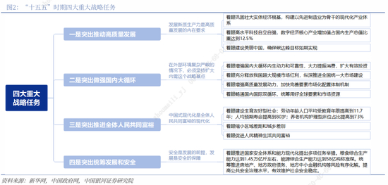 “十五五”时期主要目标和重大任务:“十五五”规划纲要(草案)中提出了20项主要指标、四大战略任务、6方面109项重大工程。20项主要指标分五大类,经济发展3项、创新驱动3项、民生福祉7项、绿色低碳5项、安全保障2项。四大战略任务为推动高质量发展、做强国内大循环、推进全体人民共同富裕、统筹发展和安全。109项重大工程分为六个方面,引领新质生产力发展28项、构建现代化基础设施体系23项、促进城乡融合发展9项、保障和改善民生25项、推动绿色低碳转型18项、重点领域安全保障6项。