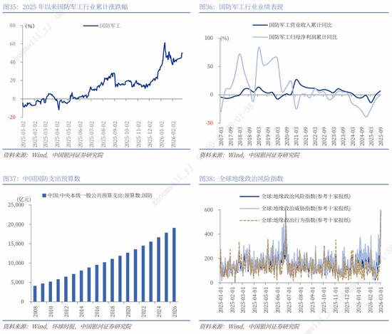 2025年初至2026年2月底,国防军工行业累计上涨49.95%。截至2月底,行业市盈率估值处于历史中高位水平。从基本面来看,行业景气度在2025年迎来拐点,营业收入和归母净利润同比增速呈现底部回暖趋势。此前“十五五”规划建议稿指出高质量推进国防和军队现代化,“推进新域新质作战力量规模化、实战化、体系化发展,加快无人智能作战力量及反制能力建设,加强传统作战力量升级改造”,“实施国防发展重大工程,加紧国防科技创新和先进技术转化,加快先进武器装备发展”,“加快新兴领域战略能力建设,推动新质生产力同新质战斗力高效融合、双向拉动”。“十五五”时期,国防预算增长、新质战力推进与军贸放量扩张有望带动行业订单增长,业绩确定性提高。近期海外地缘冲突进一步强化国防安全诉求,后续市场对军工板块关注度或将提升。