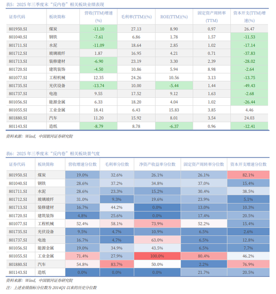 截至2025年三季度末,本轮“反内卷”重点产业中,综合营收增速、毛利率、净资产收益率、固定资产周转率、资本开支增速来看,工业金属、汽车、工程机械行业的景气度相对较高;光伏设备、造纸、建筑装饰的景气度相对较低。其中,2025年三季度末,光伏设备、造纸的营收(TTM)增速、净资产收益率(TTM)、资本开支(TTM)增速均为负值,业绩压力较大。