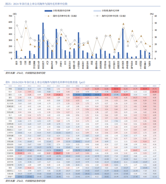 出海业务打开上市公司利润空间。随着企业加速布局全球市场,A股上市公司海外业务收入占比总体震荡上升,2024年达15.12%,较2010年上升5.13个百分点。同时,海外毛利率中位数呈上升趋势。2022年以来,全部A股上市公司海外毛利率中位数均高于同期国内毛利率中位数水平。2024年,3437家A股上市公司的海外毛利率中位数为27.83%,高于同期5140家A股上市公司的国内毛利率中位数,后者为22.92%。