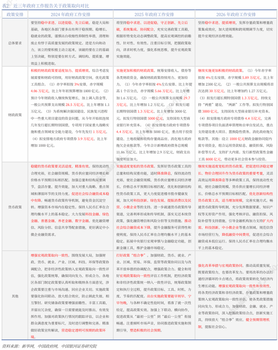 2026年总体要求和政策取向:(1)2026年经济增速目标为4.5-5.0%,并在实际工作中努力争取更好结果,较过去两年5%的增速目标有所下降;CPI目标为2%左右,持平于2025年,低于2024年;调查失业率5.5%左右,持平于2025年、2024年;单位国内生产总值能耗指标更换为单位国内生产总值二氧化碳排放,目标为单位国内生产总值二氧化碳排放降低3.8%左右。(2)2026年将坚持稳中求进、提质增效,发挥存量政策和增量政策集成效应,加大逆周期和跨周期调节力度,切实提升宏观经济治理效能。继续实施更加积极的财政政策,继续实施适度宽松的货币政策,强化改革举措与宏观政策协同。