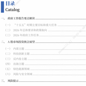 A股市场投资机会展望:2026年政府工作报告明确经济增长目标区间,要求强化改革举措与宏观政策协同,围绕内需主导、培育壮大新动能、高水平科技自立自强等任务部署,划定投资主线,为市场全年运行提供清晰政策指引,利好投资者信心提升与结构性行情展开。建议关注政策赋能的内需板块、高水平科技自立自强的科技创新板块、格局优化的反内卷板块、能级跃升的出海板块、融合赋能的绿色能源板块、统筹发展和安全的风险与安全板块。