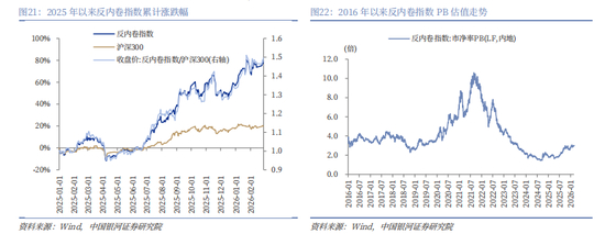 从市场表现来看,2025年以来,反内卷指数(8841916.WI)显著跑赢沪深300指数,截至2026年2月末,反内卷指数累计上涨79.12%,同期沪深300指数上涨19.71%。截至2月末,反内卷指数的PB估值为3.01倍,处于2016年以来29.59%分位数水平。