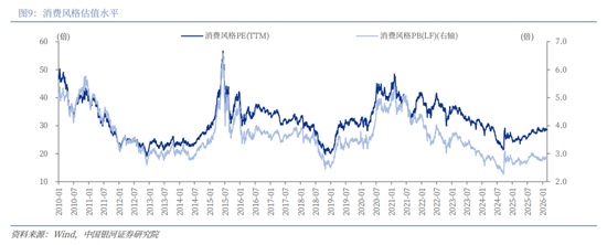 截至2026年2月27日,消费风格PE(TTM)为28.60倍,处于2010年以来35.06%分位数水平;PB(LF)为2.81倍,处于2010年以来11.01%分位数水平。