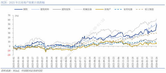 2025年以来,地产链整体收涨,但表现分化较大。2025年初至2026年2月底,机械设备上涨61.59%,建筑材料和钢铁也涨近50%,轻工制造涨29.65%,而建筑装饰、家用电器、房地产涨幅相对居后,分别上涨17.49%、9.18%、6.14%。