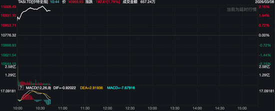 沙特基准股指TASI早盘高开超1%后,震荡上行,盘中最大涨幅扩大至超2%。