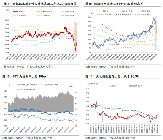 美元指数大幅升值1.34%至98.96。欧元日元跟随美元波动,美元兑欧元上行1.7%。美元兑日元全周上行1.09%,收于157.8。本周日元波动升至9.6%,但套息性价比(美日利差/日元隐波)继续下降,日元投机净头寸(多-空)重新转空,小幅增加1.6万张,全球套息交易活动指数升至264.18,创历史新高。人民币汇率在国内政策协调下保持稳健,USDCNH周涨0.7%至6.91。