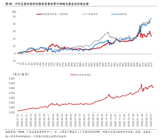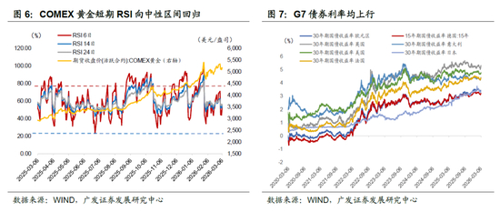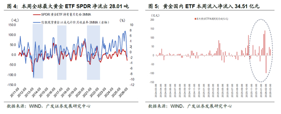 二是全球商品波动分化,“避险交易、事件交易、对冲交易”交织,多重地缘风险驱动原油暴涨,黄金波动加剧,铜价高位下跌,国内定价品种温和。原油市场受地缘风险溢价驱动进一步强化,布伦特原油期货(活跃合约)周涨27.88%。WTI原油价格涨超35%,两者报收均超90美元/桶。金银比小幅上升至62.3,白银跌幅大幅超过黄金;美元反弹,降息预期反复,以及石油美元预期共振下,伦敦金现震荡下跌,收于5127.6美元/盎司,全周跌1.8%;伦敦银现全周跌8.5%;2026年开年至今,金银分别收录YTD 19.03%,14.38%。技术视角下,黄金隐波周内一度突破新高至38.77%,远高于自身波动中枢(15~20%),与常态状态下白银波动相近。COMEX黄金短期RSI波动加剧,向中性区间回归。资金需求方面,国内ETF仍呈净流入。国内黄金ETF本周净流入34.51亿元(上周为净流入47.01亿元)。而全球最大黄金ETF SPDR净流出28.01吨。跨市场方面,美元指数反弹带动人民币汇率回调,沪金溢价有所回升,沪金全周跌0.32%,沪金溢价倒算黄金购买力平价升至6.9111。